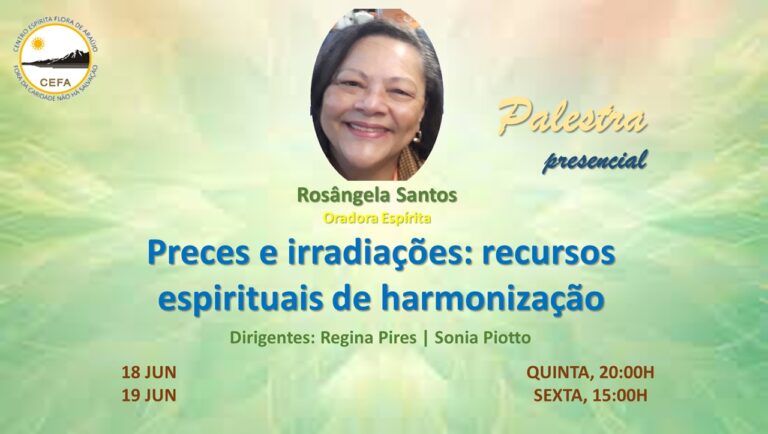 Evento Presencial – Tv. Flora de Araújo, 35 – Campos Elíseos – Resende-RJRealizamos todas as terças-feiras, a prece de irradiação. Nesta prece, vibrações superiores são enviadas a todos os necessitados do planeta, e de um modo especial a todos que solicitam o auxílio da prece, para si, para outros, sejam estes encarnados ou desencarnados.